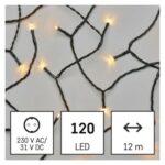 časovač: áno|diaľkový ovládač: nie|dĺžka prívodu: 5 m|farba drôtu: zelená|farba svetla: vintage|funkcia: svieti|krytie: IP44|LED medzera: 10 cm|materiál: PVC|možnosť prepojenia: nie|počet LED: 120|použitie: vonkajšie aj vnútorné|predajný obal: 1 ks, krabica|pre výšku stromu: 170 cm|príkon: 3,6 W|produkt: reťaz|rozmer: 12 m|tvar: klasický|typ napájania: sieťový adaptér|veľkosť LED: 5 mm|vstupné napätie: 230 V AC|výstupné napätie: 31 V DC|záručná doba: 2 roky|životnosť: 10 000 hodín