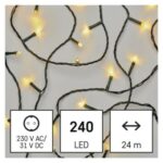 časovač: nie|diaľkový ovládač: nie|dĺžka prívodu: 5 m|farba drôtu: zelená|farba svetla: teplá biela|funkcia: 8 módov (multifunkcie)|krytie: IP44|LED medzera: 10 cm|materiál: PVC|možnosť prepojenia: nie|počet LED: 240|použitie: vonkajšie aj vnútorné|predajný obal: 1 ks, krabica|pre výšku stromu: 230 cm|príkon: 3,6 W|produkt: reťaz|rozmer: 24 m|tvar: klasický|typ napájania: sieťový adaptér|veľkosť LED: 5 mm|vstupné napätie: 230 V AC|výstupné napätie: 31 V DC|záručná doba: 2 roky|životnosť: 10 000 hodín
