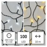 časovač: nie|diaľkový ovládač: nie|dĺžka prívodu: 5 m|farba drôtu: čierna|farba svetla: studená/teplá biela|funkcia: 8 módov (multifunkcie)|krytie: IP44|LED medzera: 10 cm|materiál: PVC|možnosť prepojenia: nie|počet LED: 100|použitie: vonkajšie aj vnútorné|predajný obal: 1 ks, krabica|pre výšku stromu: 160 cm|príkon: 3,6 W|produkt: reťaz|rozmer: 10 m|tvar: klasický|typ napájania: sieťový adaptér|veľkosť LED: 5 mm|vstupné napätie: 230 V AC|výstupné napätie: 31 V DC|záručná doba: 2 roky|životnosť: 10 000 hodín