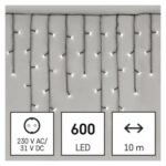 časovač: nie|diaľkový ovládač: nie|dĺžka prívodu: 5 m|farba drôtu: zelená|farba svetla: studená biela|funkcia: 8 módov (multifunkcie)|krytie: IP44|LED medzera: 10 cm|materiál: PVC|možnosť prepojenia: nie|počet LED: 600|použitie: vonkajšie aj vnútorné|predajný obal: 1 ks, krabica|pre výšku stromu: neuvádza sa|príkon: 9 W|produkt: kvaple|rozmer: 10 × 0,7 m|tvar: klasický|typ napájania: sieťový adaptér|veľkosť LED: 5 mm|vstupné napätie: 230 V AC|výstupné napätie: 31 V DC|záručná doba: 2 roky|životnosť: 10 000 hodín