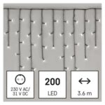 časovač: nie|diaľkový ovládač: nie|dĺžka prívodu: 5 m|farba drôtu: zelená|farba svetla: studená biela|funkcia: 8 módov (multifunkcie)|krytie: IP44|LED medzera: 10 cm|materiál: PVC|možnosť prepojenia: nie|počet LED: 200|použitie: vonkajšie aj vnútorné|predajný obal: 1 ks, krabica|pre výšku stromu: neuvádza sa|príkon: 3,6 W|produkt: kvaple|rozmer: 3,6 m|tvar: klasický|typ napájania: sieťový adaptér|veľkosť LED: 5 mm|vstupné napätie: 230 V AC|výstupné napätie: 31 V DC|záručná doba: 2 roky|životnosť: 10 000 hodín