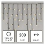 časovač: nie|diaľkový ovládač: nie|dĺžka prívodu: 5 m|farba drôtu: zelená|farba svetla: teplá biela|funkcia: 8 módov (multifunkcie)|krytie: IP44|LED medzera: 10 cm|materiál: PVC|možnosť prepojenia: nie|počet LED: 200|použitie: vonkajšie aj vnútorné|predajný obal: 1 ks, krabica|pre výšku stromu: neuvádza sa|príkon: 3,6 W|produkt: kvaple|rozmer: 3,6 m|tvar: klasický|typ napájania: sieťový adaptér|veľkosť LED: 5 mm|vstupné napätie: 230 V AC|výstupné napätie: 31 V DC|záručná doba: 2 roky|životnosť: 10 000 hodín